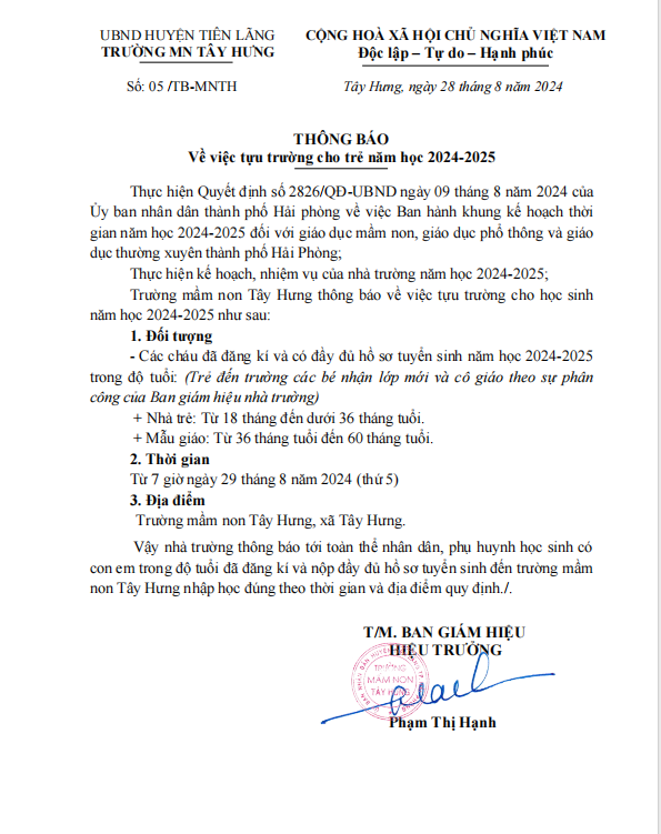 Thông báo Tựu trường. Năm học 2024 - 2025