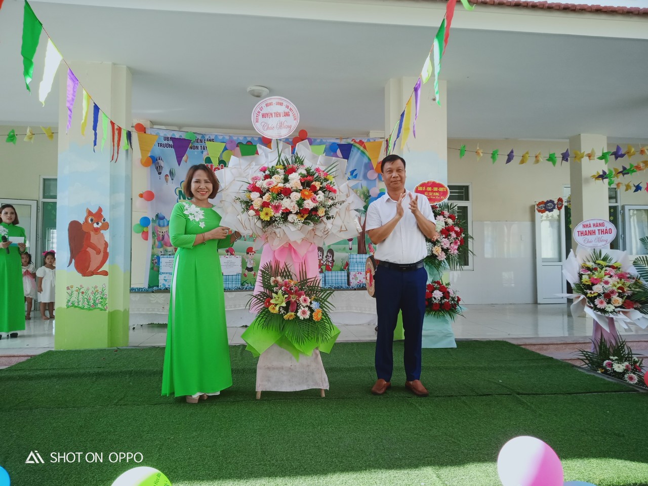 Bác Lê Bảo Ngọc Phó trưởng ban dân vận huyện ủy tặng hoa chúc mừng cô trò nhà trường trong ngày khai giảng năm học mới 2022-2023